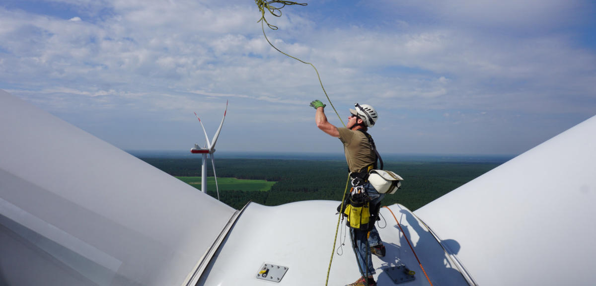 Rotorblattgutachten an Windkraftanlagen mittels Seiltechnik.